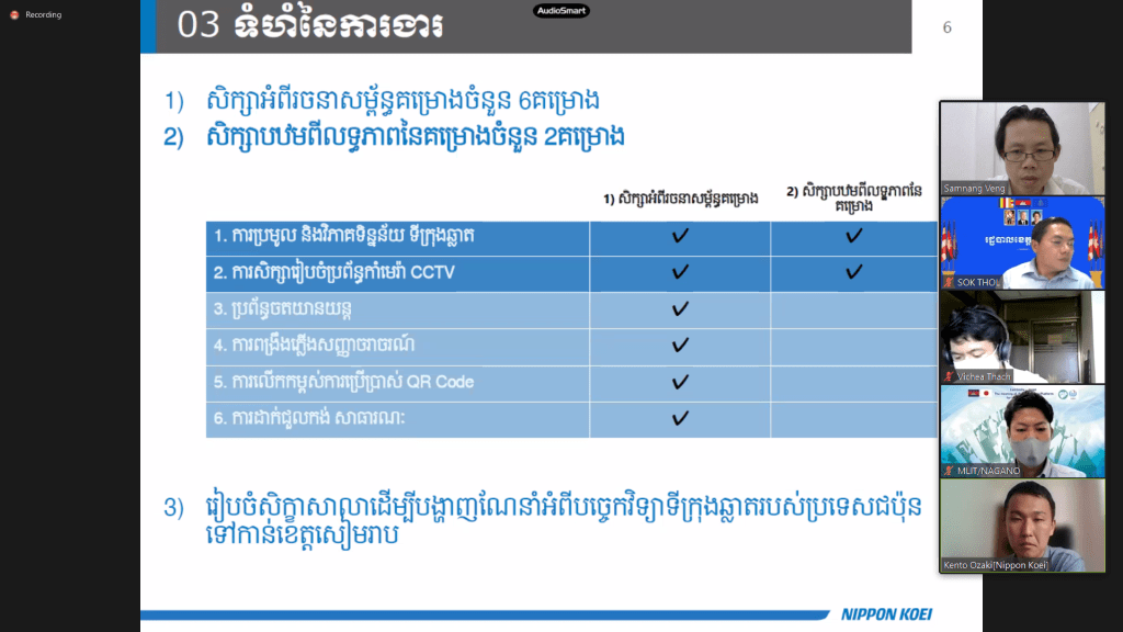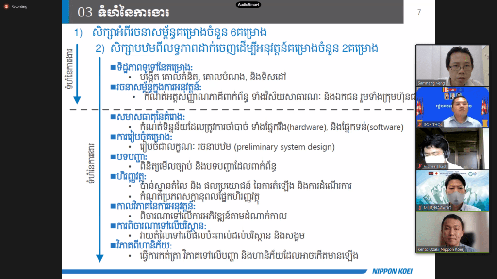 第3回 日・カンボジア都市開発・不動産開発プラットフォーム会合は、日本国道交通省及びカンボジア国土都市計画建設省の共同議長の下で、オンライン形式で開催されました。日本の都市開発歴史と特徴やカンボジア都市開発課題やパイロットプロジェクトの進捗状況やSmart-JAMPプロジェクト紹介や日・カンボジア民間企業の紹介など貴重な資料・情報が数多く触れられました。その機会で、同時通訳として勤めさせていただきました。貴重な体験をありがとうございました。また、次の機会がありましたら、是非ご協力させていただきたいですね。