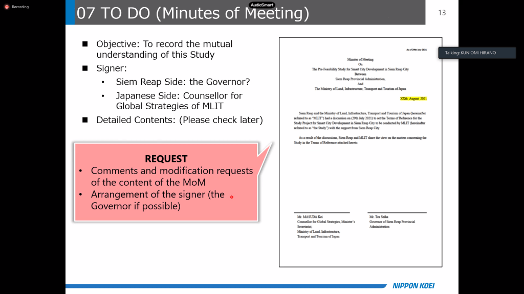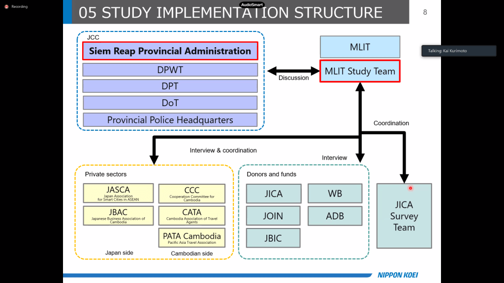 本日、日本国道交通省(MLIT)とシエムリアップ州行政は、スマートシティ実現向けのSMART-JAM調査案件について、オンライン協議会議を行った。その際、通訳担当させていただきました。