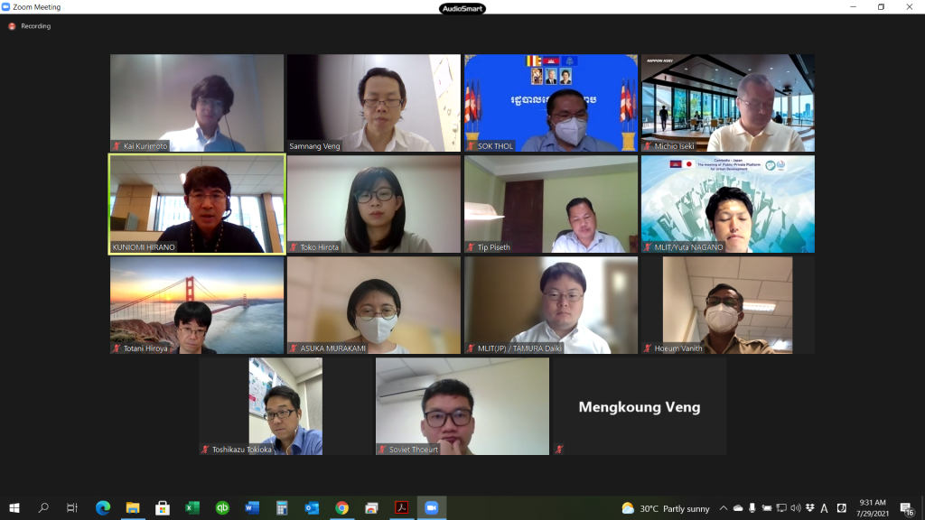 2021年5月20日:日本国道交通省とカンボジア国土計画建設省を含んで、BPC社との日本企業とのオンライン検討会議が開催されました。その際、私が通訳業務を担当させていただきました。スマートシティ開発に関する日・カンボジアプラットフォーム会議と意見交換会議の後、今回の会議では、スマートシティ開発に関する進捗状況報告の後、相互理解に向け調整事項などについて、意見交換が行われました。